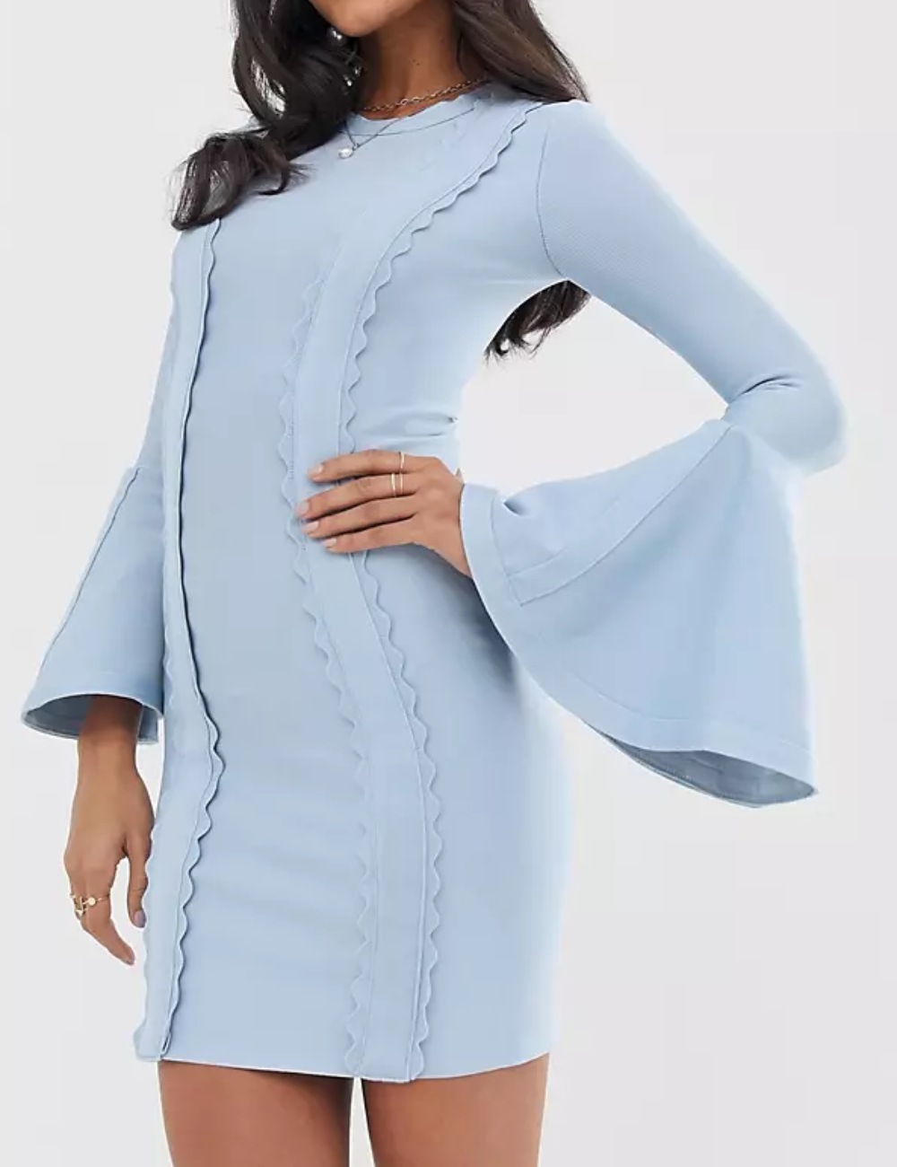 Asos light blue bodycon short dress with flute sleeves and zipper down the back, size UK 16