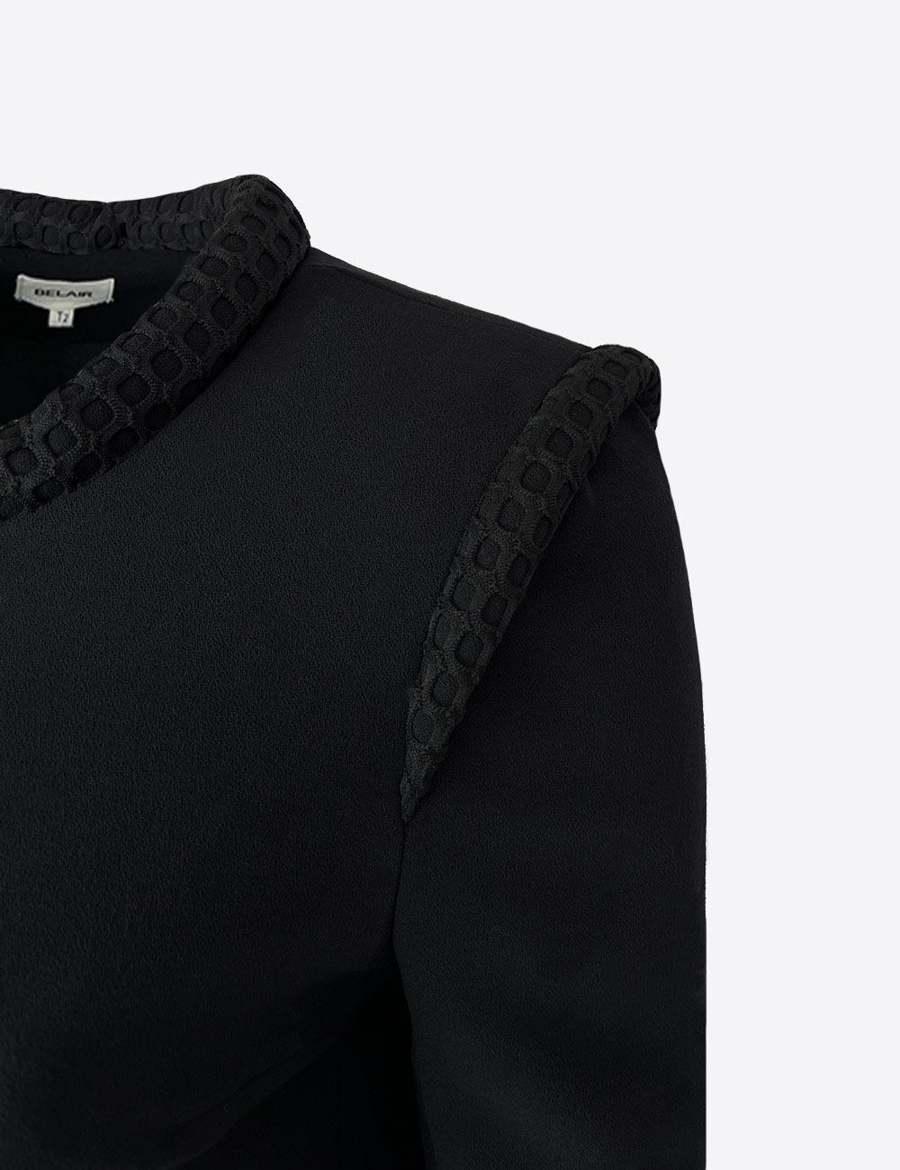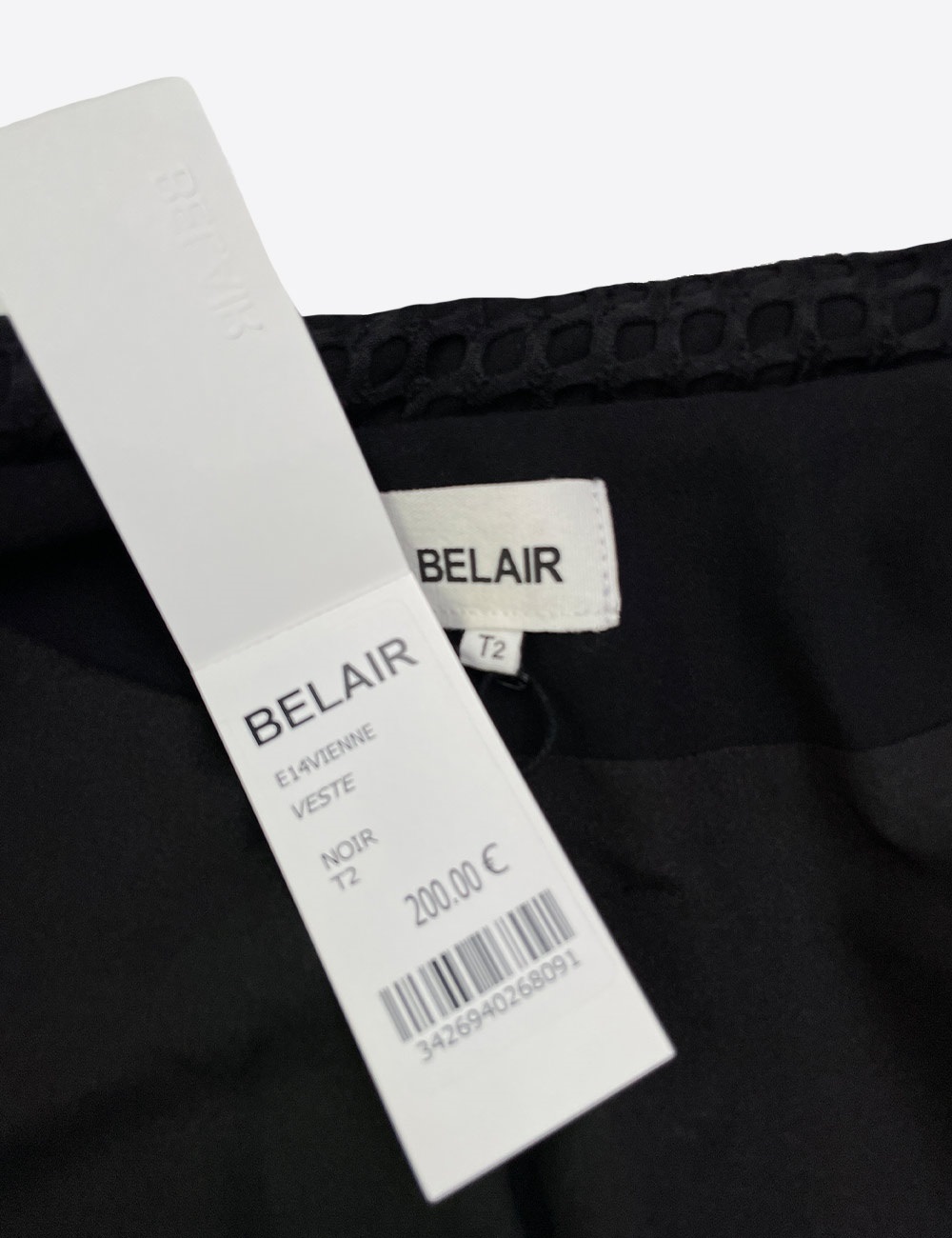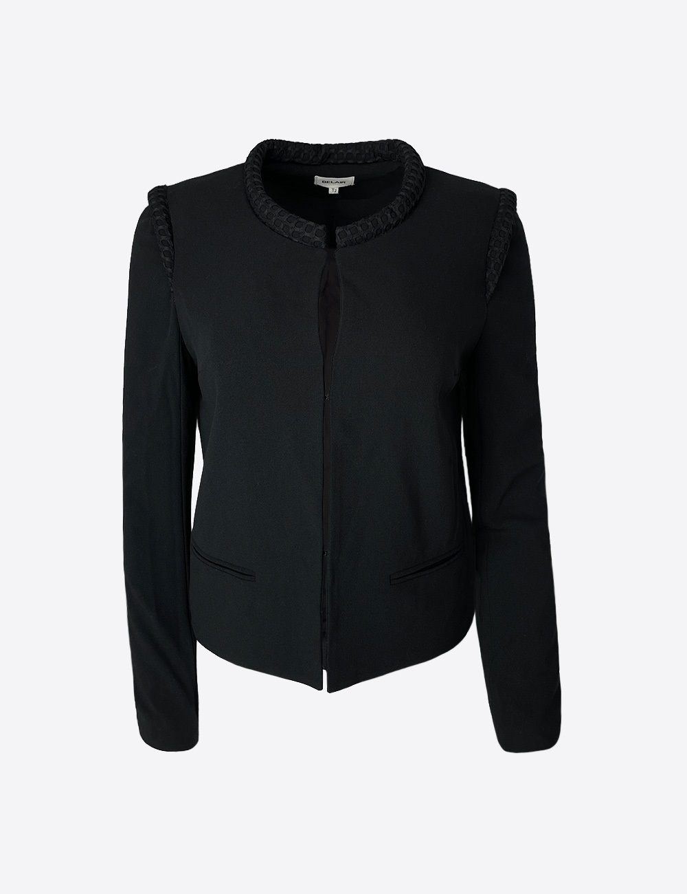 Belair black jacket with shoulder pads and detailed pattern around neck, size T2 (fits size S)