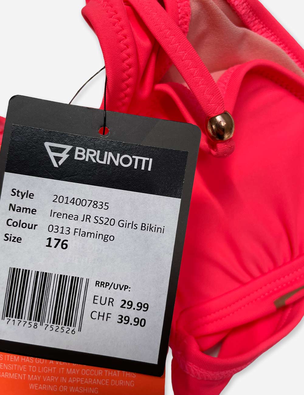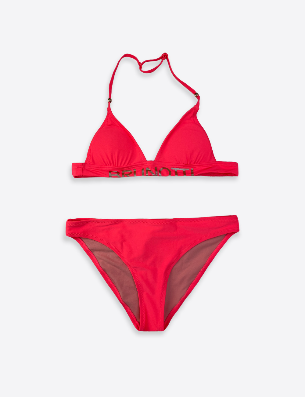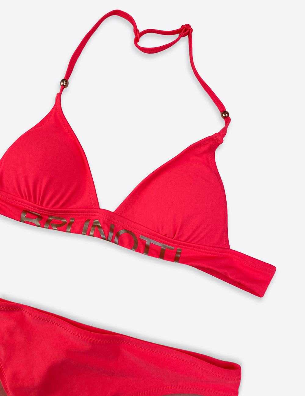 Brunotti neon spicy orange bikini swimsuit with metallic “Brunotti” print on bikini top hem and metallic logo on back side of bikini bottom and padded top, size 176cm