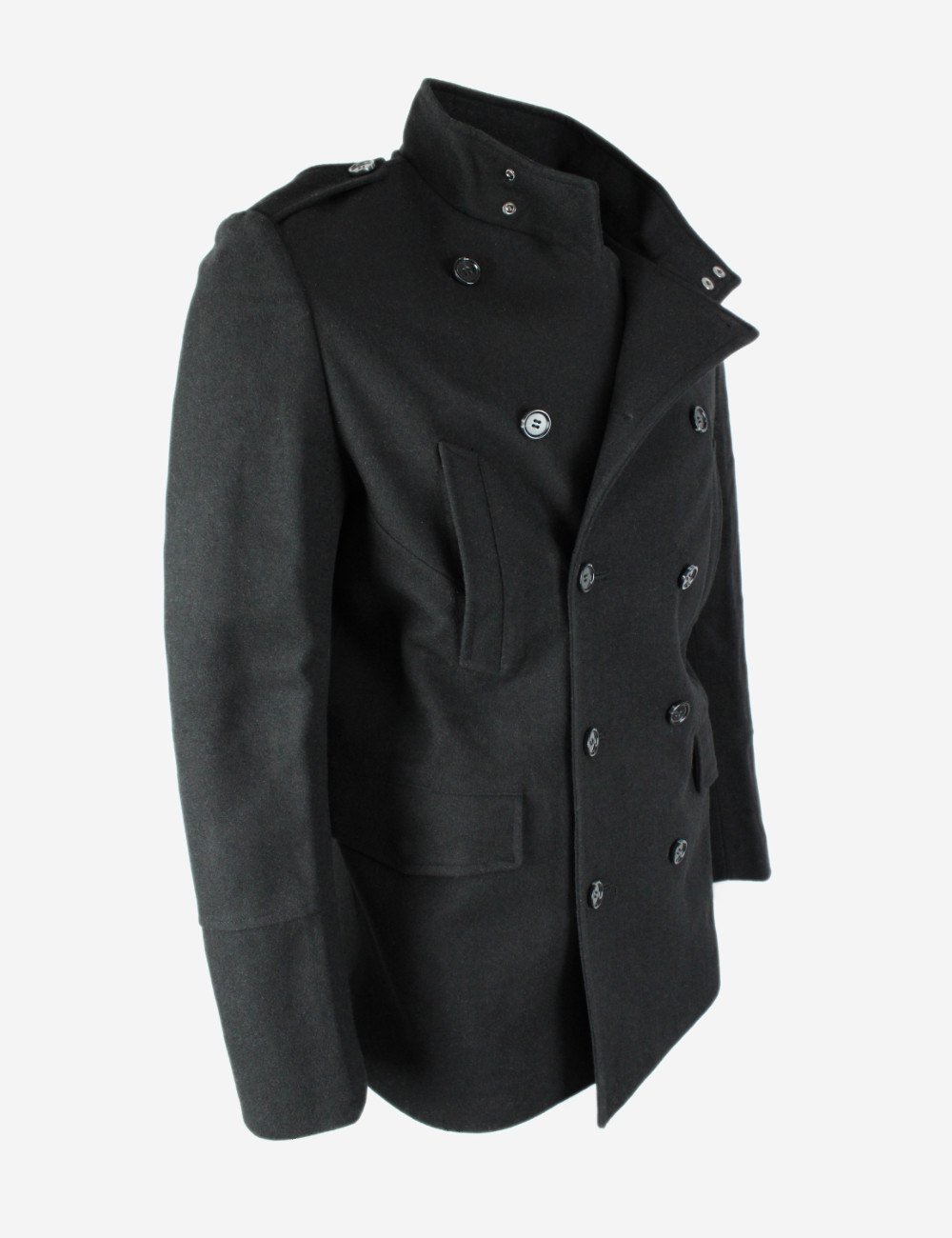 Mid length wool coat double breasted military collar and shoulders