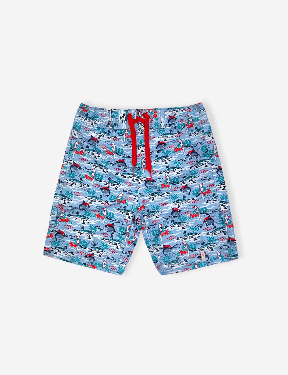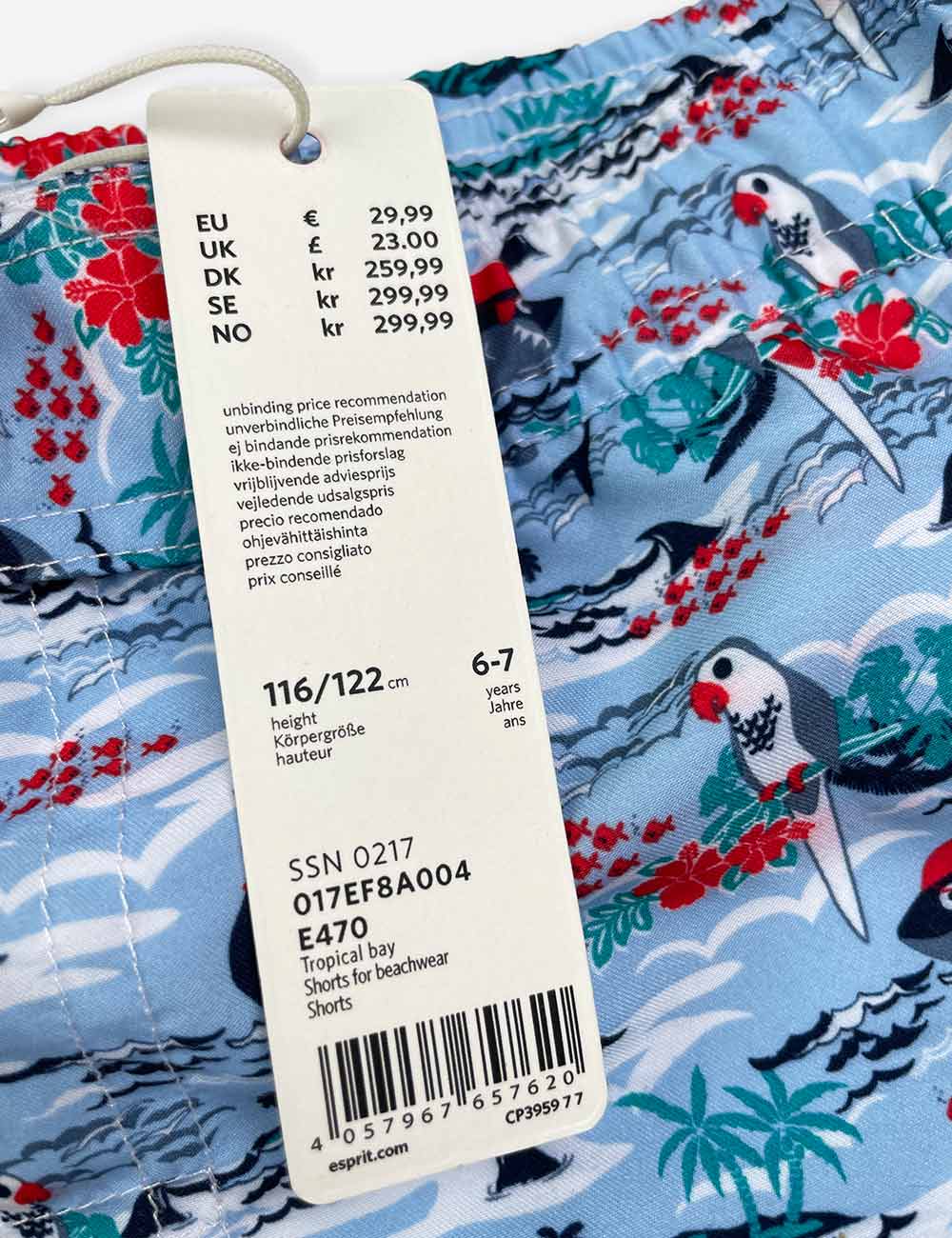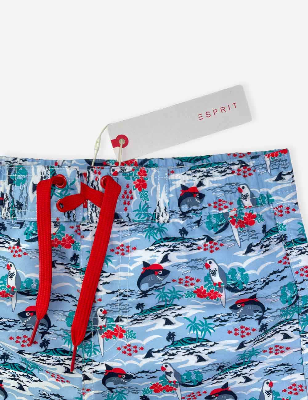 Esprit blue swim shorts with sea theme design, red drawstrings on waist and back pocket, size 6-7 years (116/122 cm)