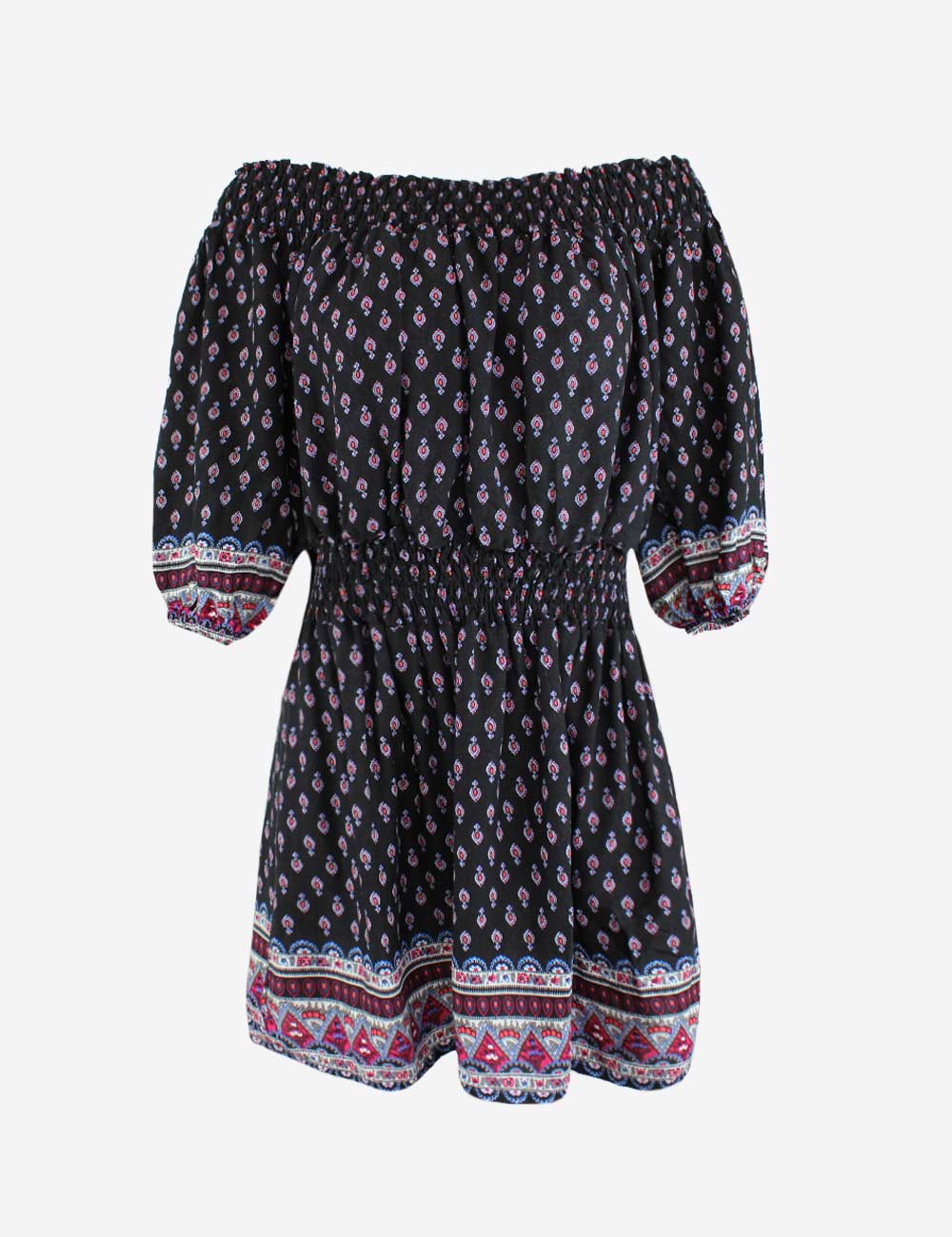 Glamorous navy short off shoulder dress with puffy sleeves and folk pattern, size XS