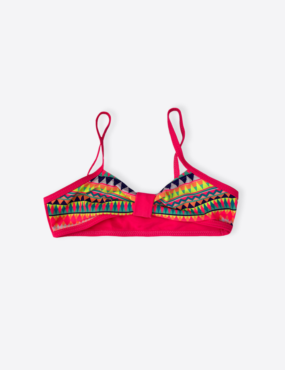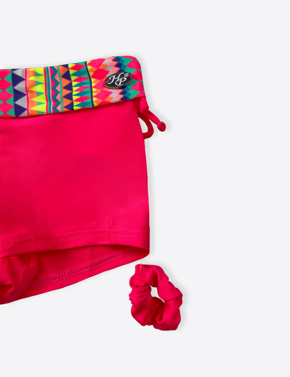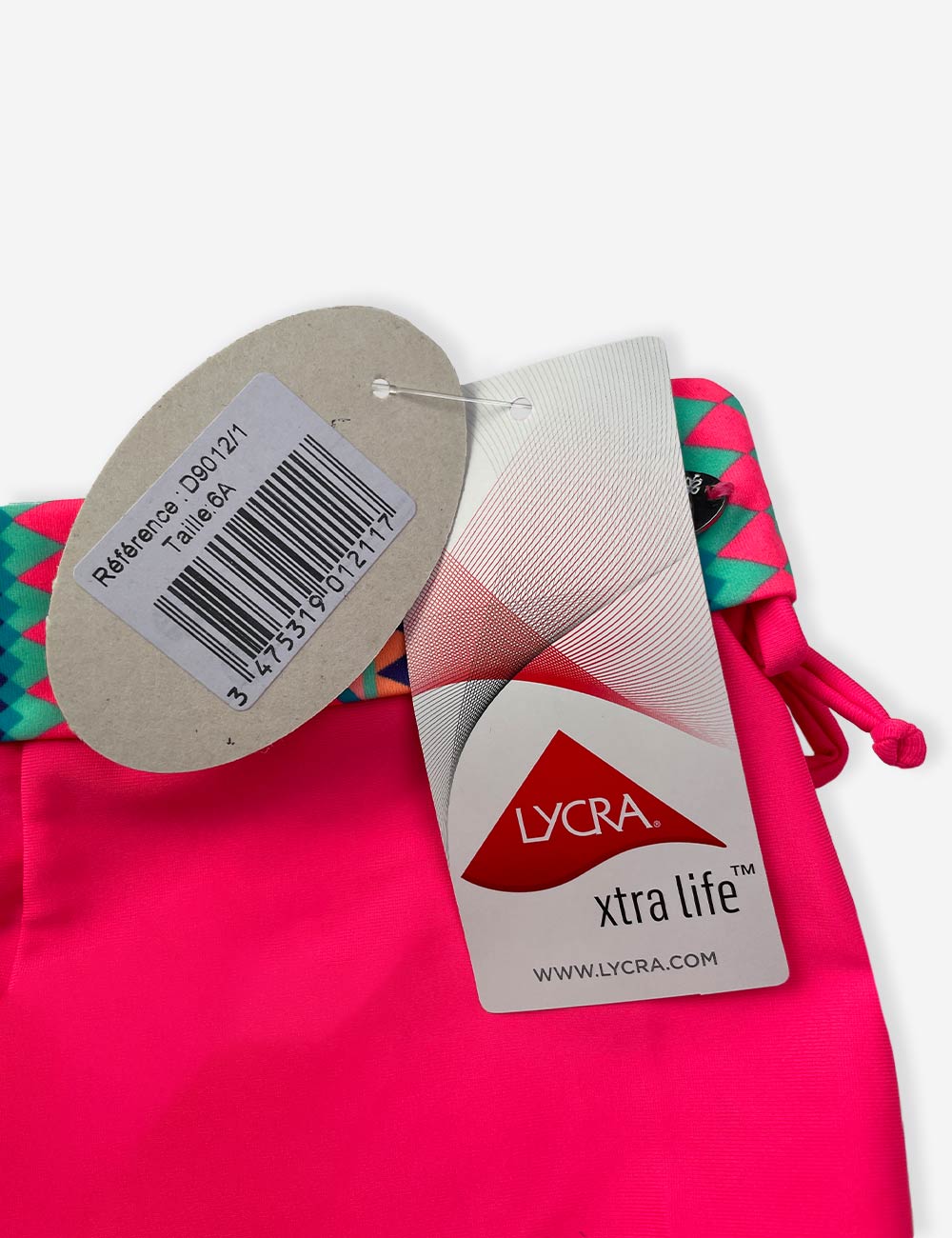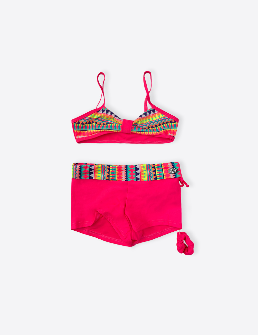 Haute Pression neon pink with geometric pattern bikini set with short bottoms and hair scrunchie, size 6 years