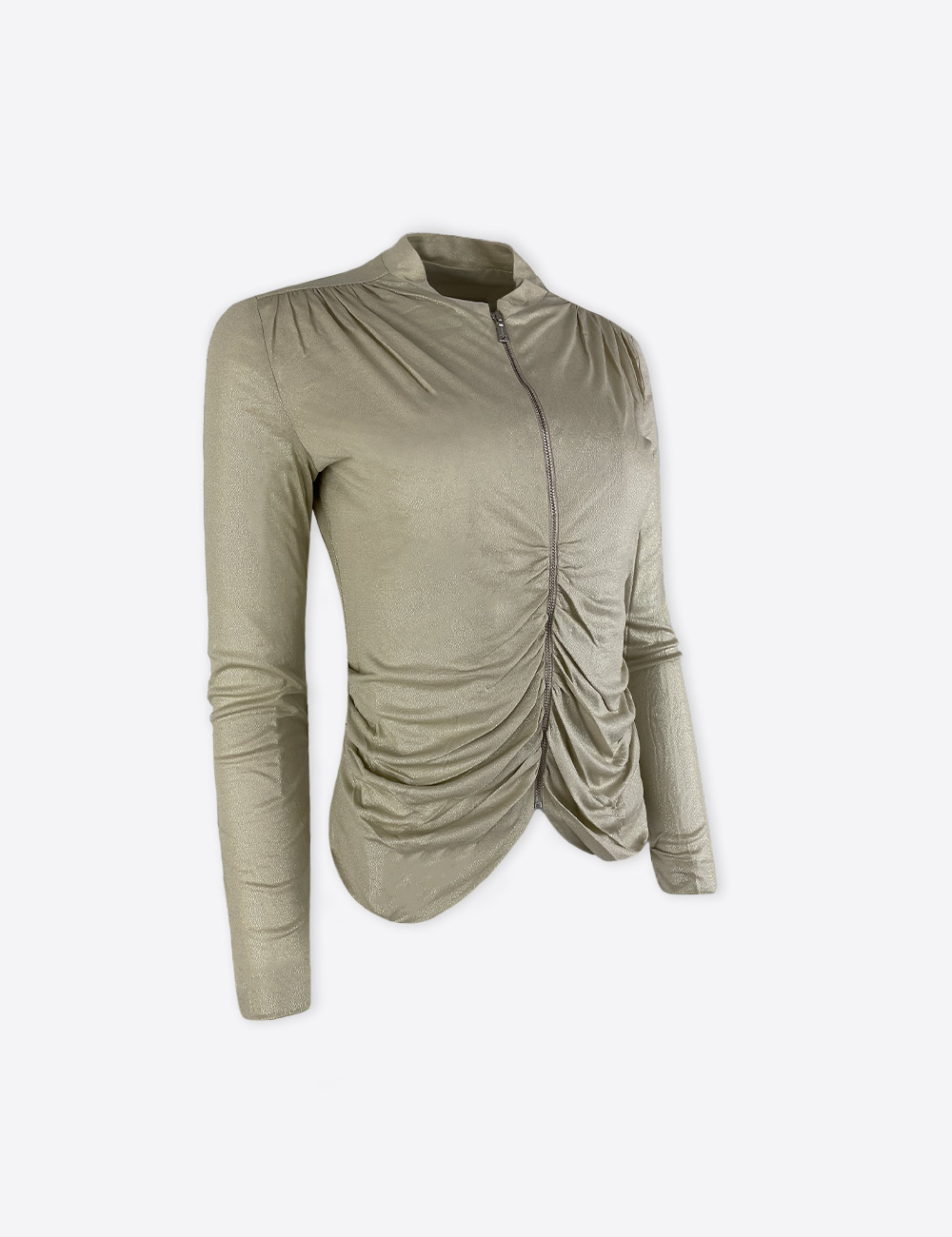 John Richmond London light gold like jacket with long sleeves, zipper down the middle and ruched design in the front, size M (IT 42)