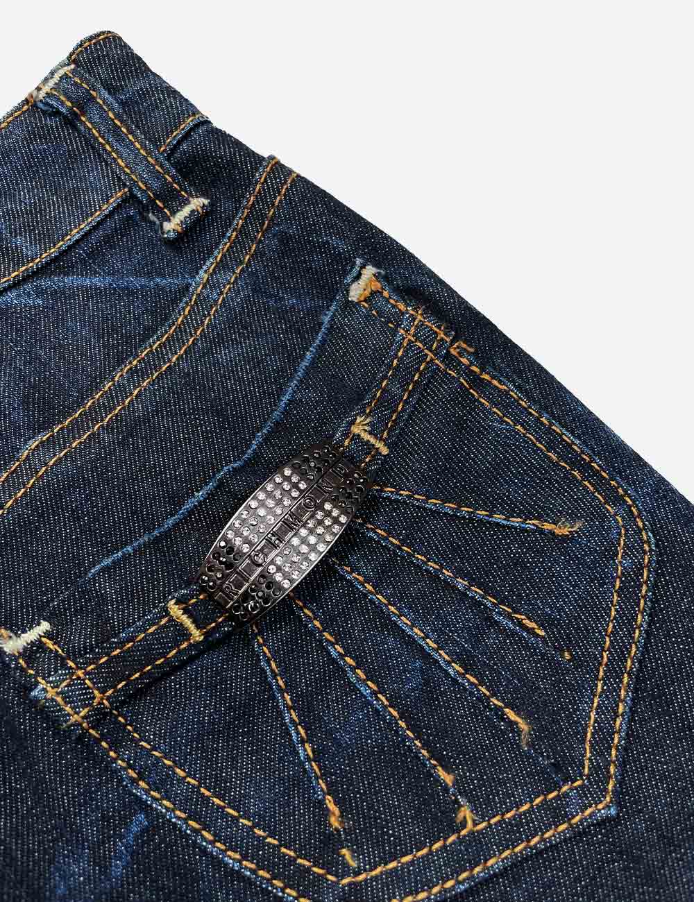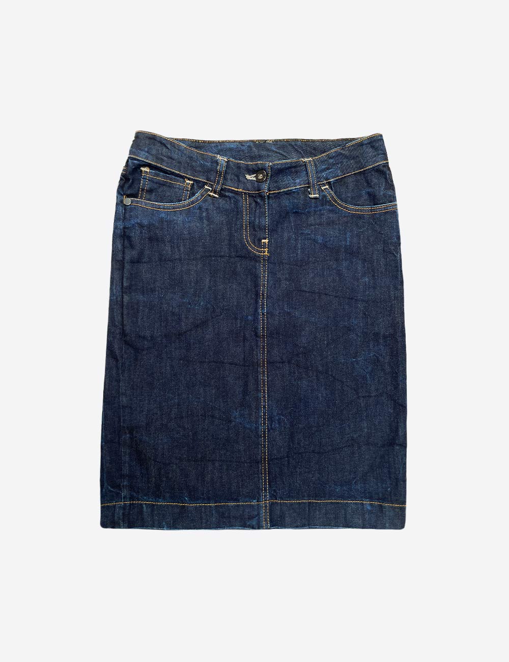 John Richmond navy denim high waist knee length skirt with fabric design and embellishment on back pockets and back slit, size IT 42 (fits EU 36)