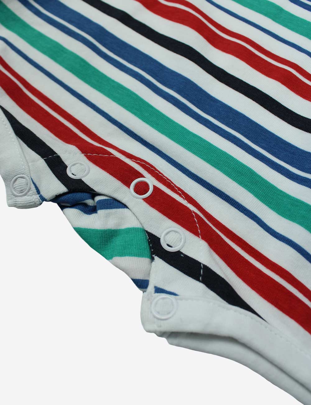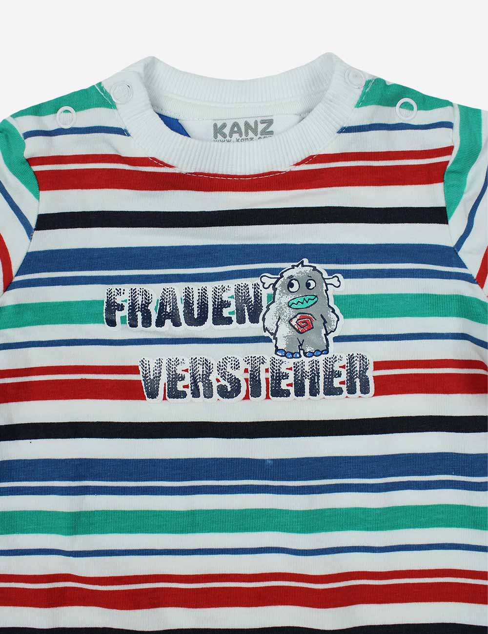 Kanz baby boy short sleeves short overall with red, green, navy and white stripes, snap buttons on shoulders and print on chest, size 0-3 months (62 cm)