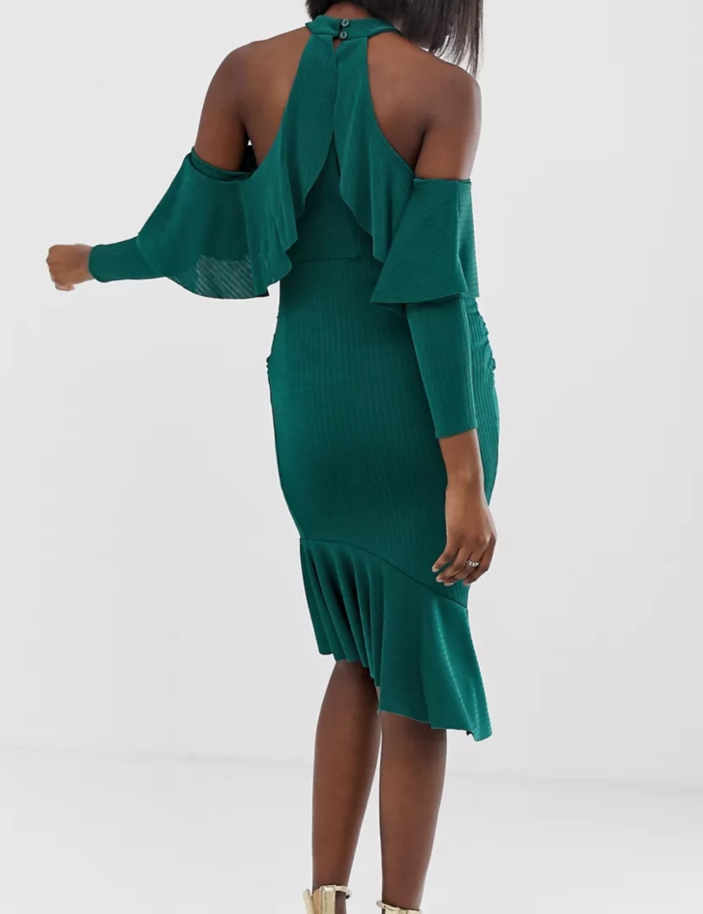 Maternity high neck ruffle cold shoulder midi dress with pep hem