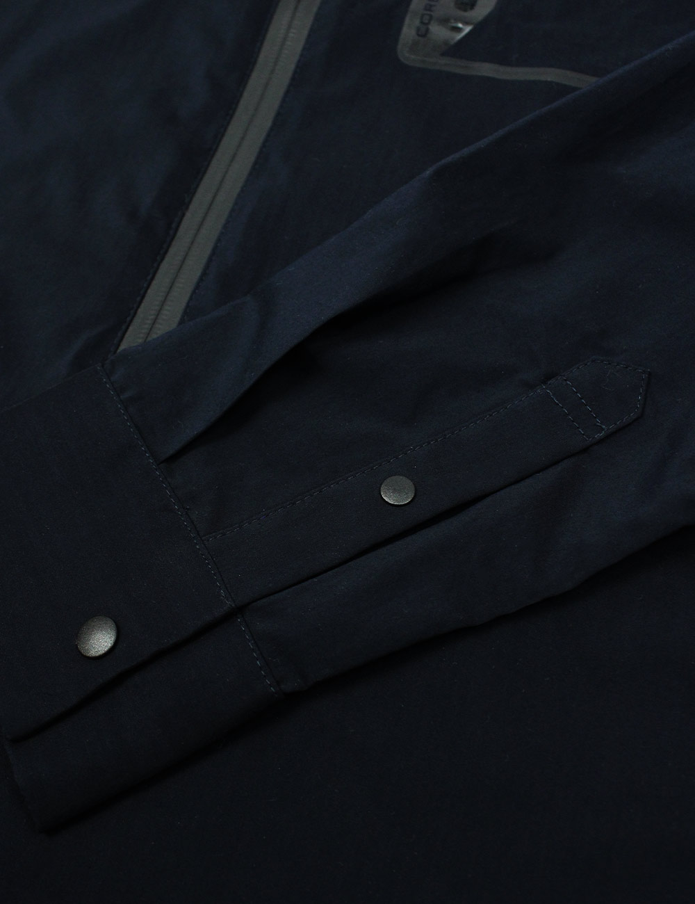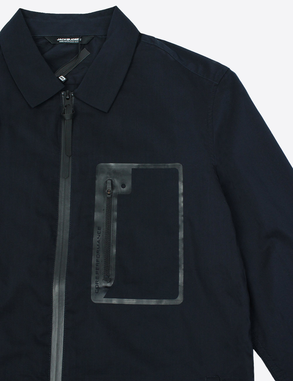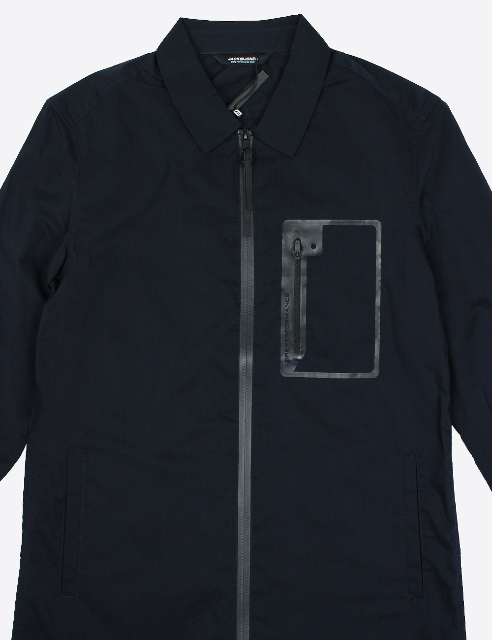 Jack & Jones navy core performance wear long sleeve shirt with zipper down the middle, side pockets and a breast pocket with zipper, size S/40 (170/92A)