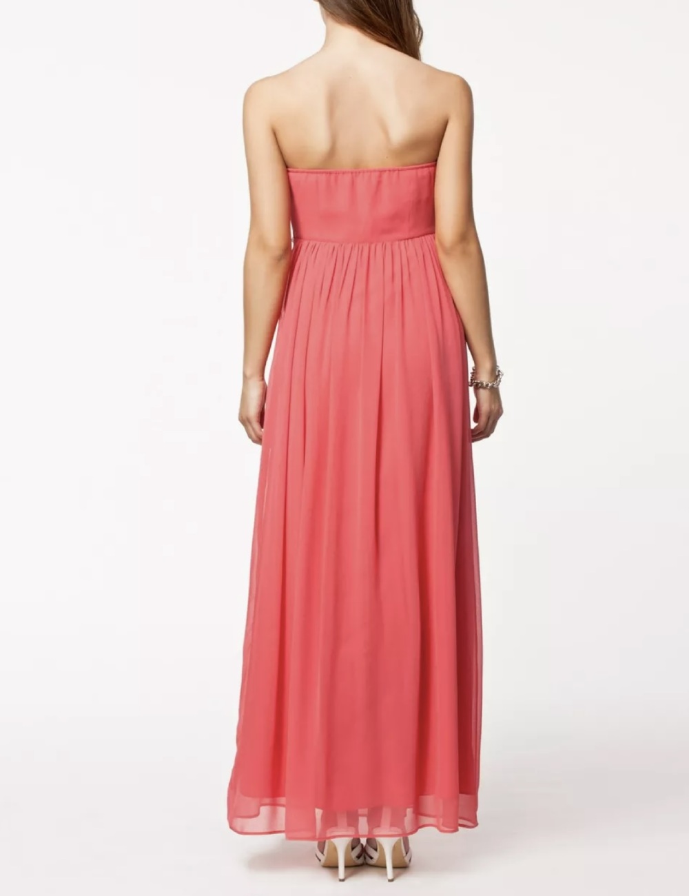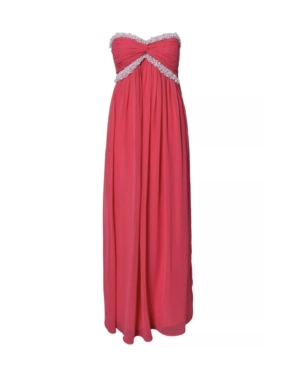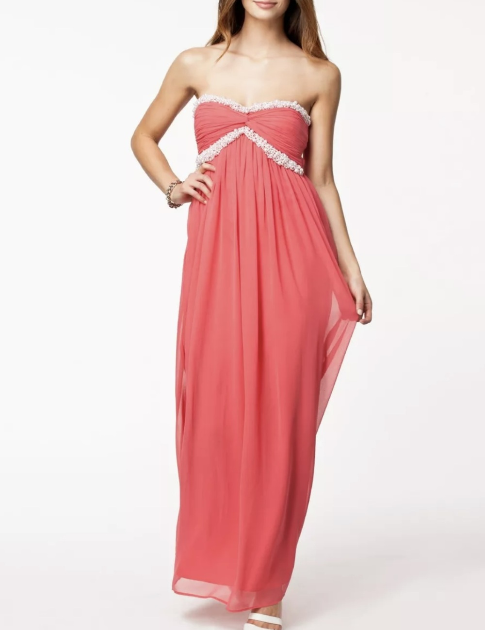 NLY Trend coral maxi dress with sweetheart neckline. Bandeau design with pleats and pearl beads at top, size 34, 36