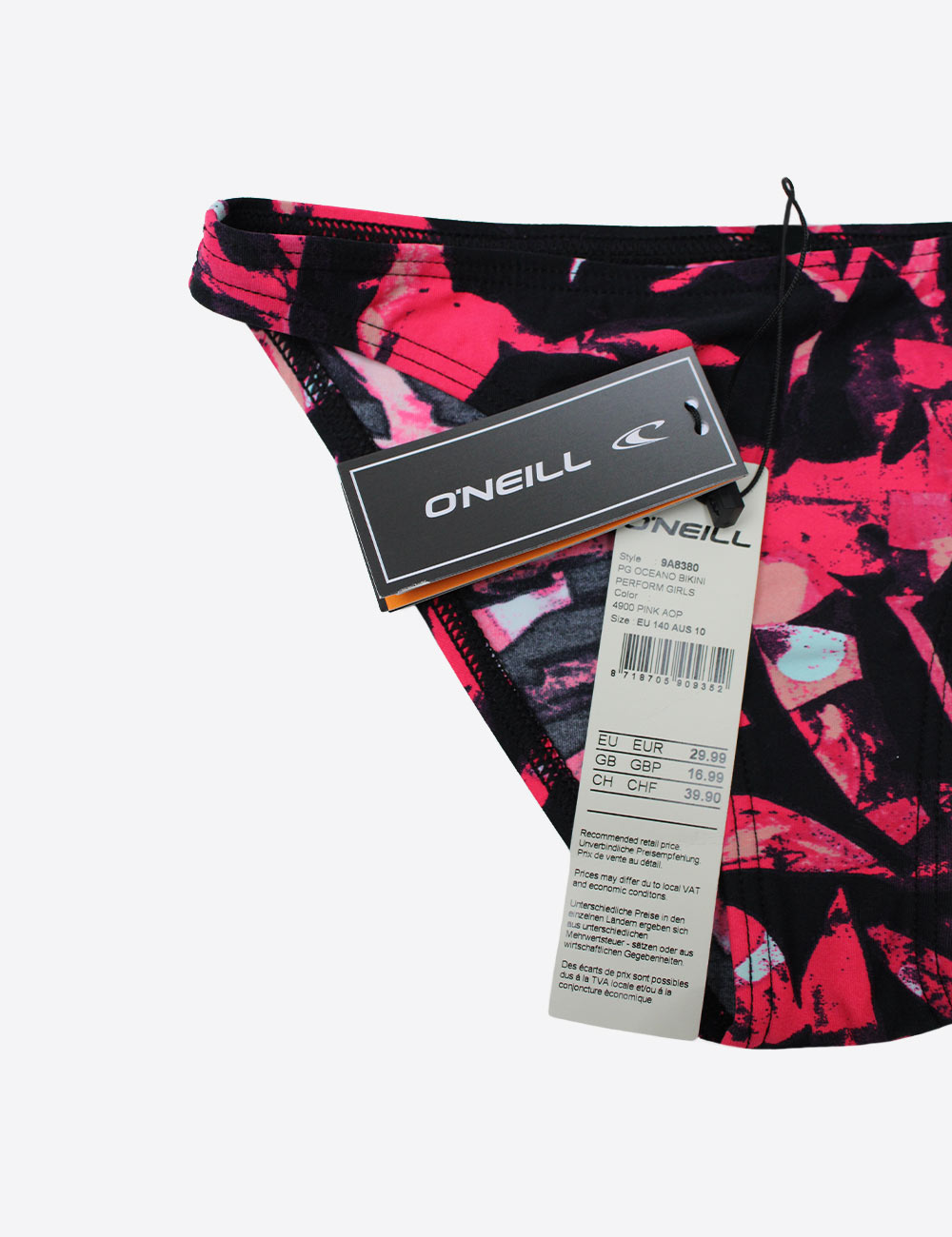O’Neill black bikini swim set with pink coral patterns with adjustable straps, removable padding and hip fit bottoms with quick drying properties, size 10 years (140 cm)