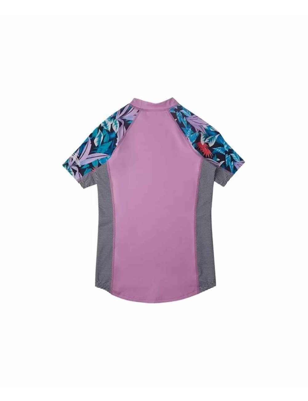 O’Neill Lavender wetsuit top short sleeves with tropical leaves on the sleeves and horizontal navy and white stripes on the side, 50+ Ultraviolet Protection, size 12 years