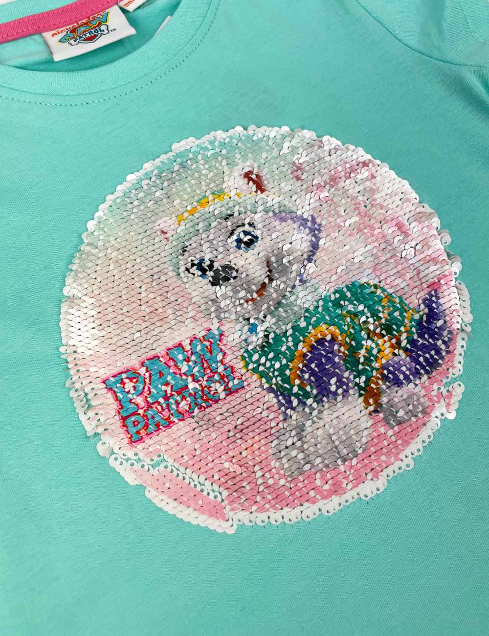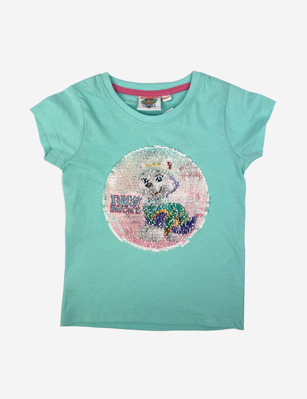 Paw Patrol aqua short sleeve t-shirt with changing sequins of two Paw Patrol characters, size 122/128 cm