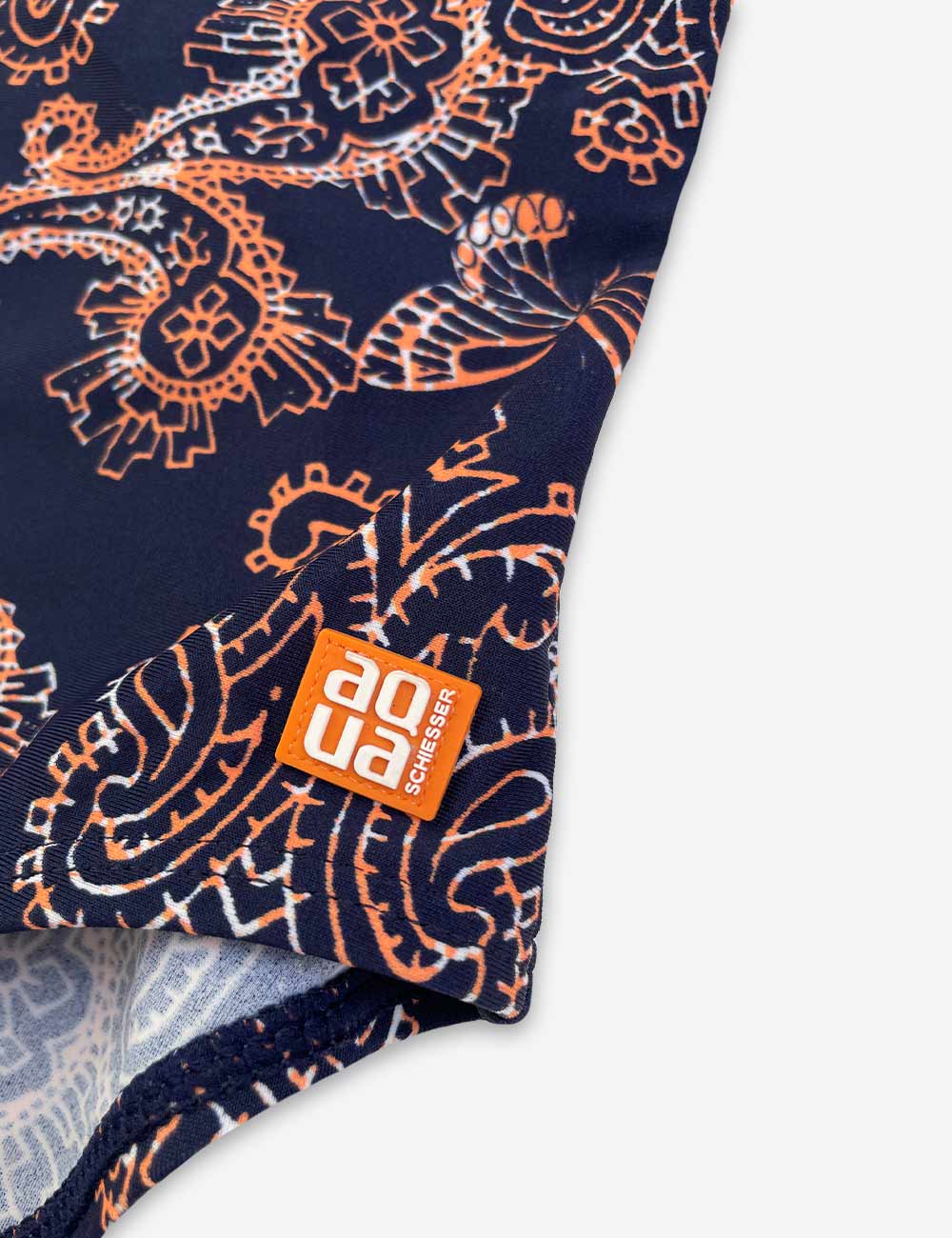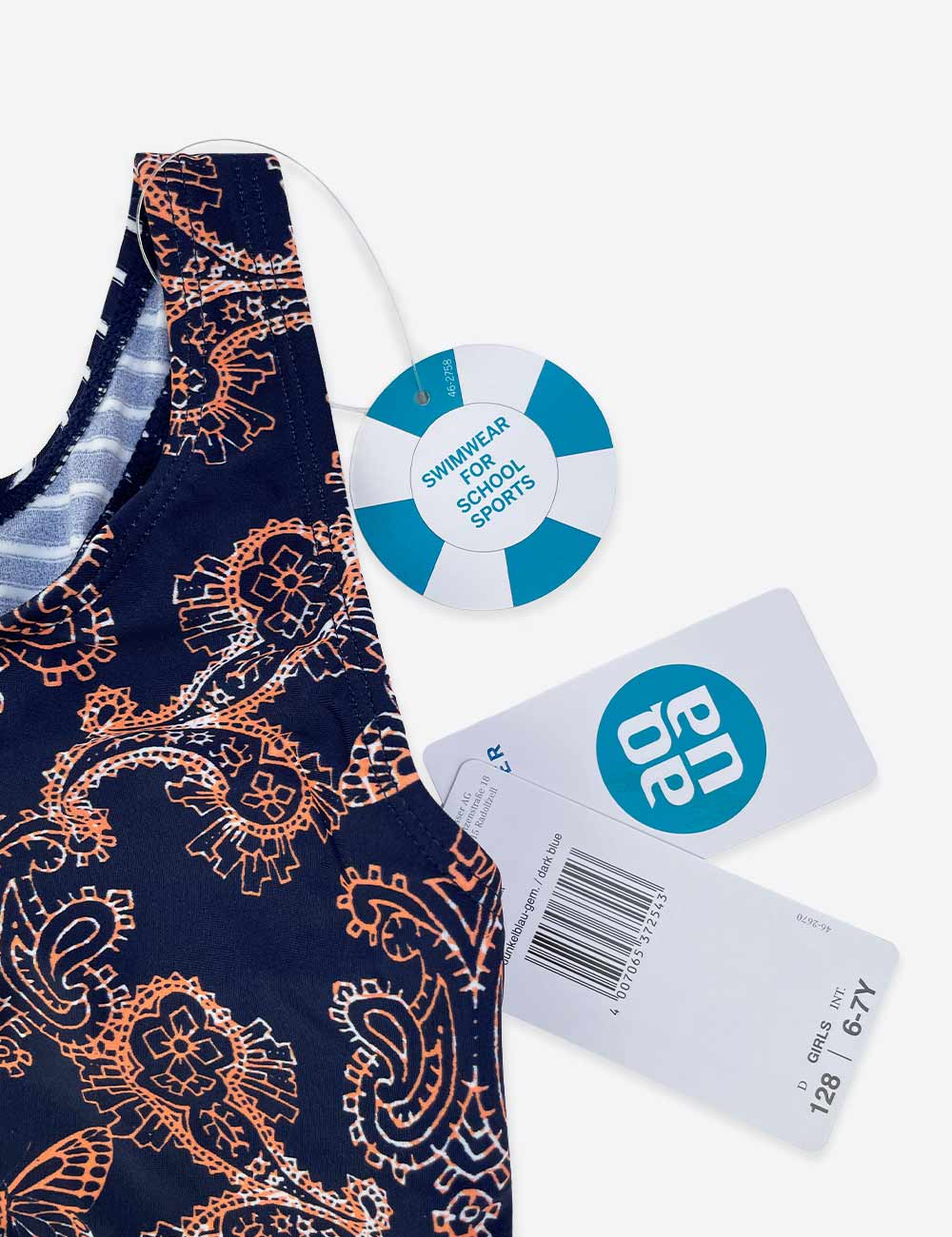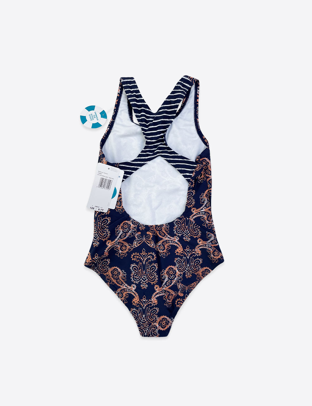 Schiesser Aqua navy one piece swimsuit with pattern design and navy and white striped straps, 80% polyamide 20% elastane, size 6-7 years (128 cm)