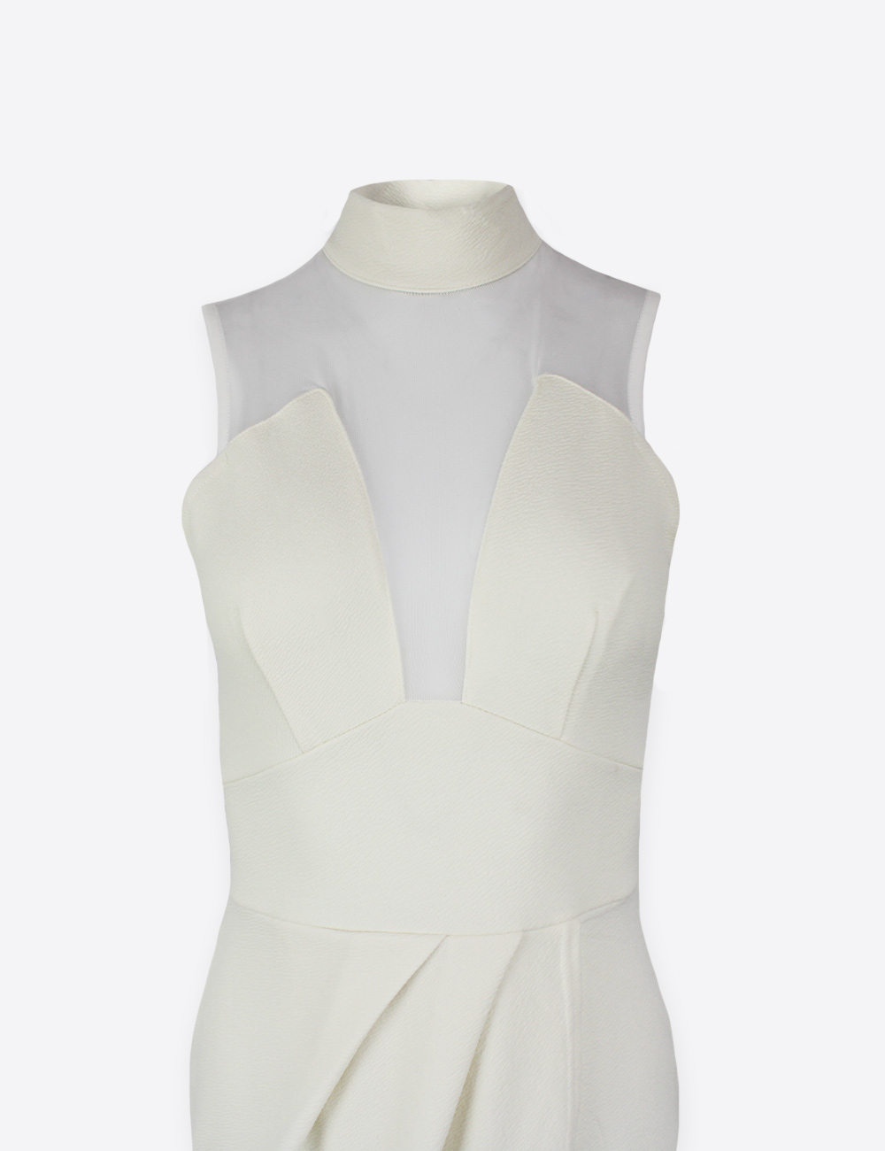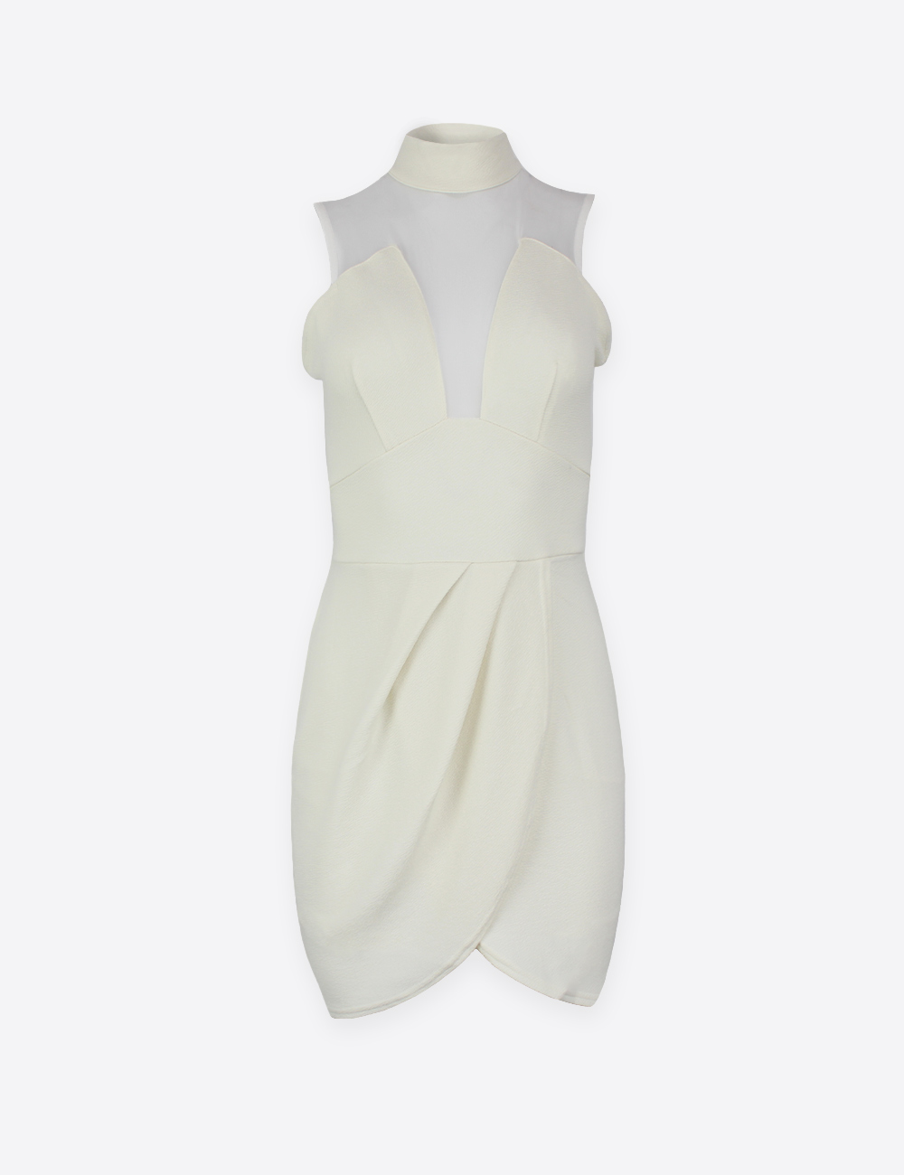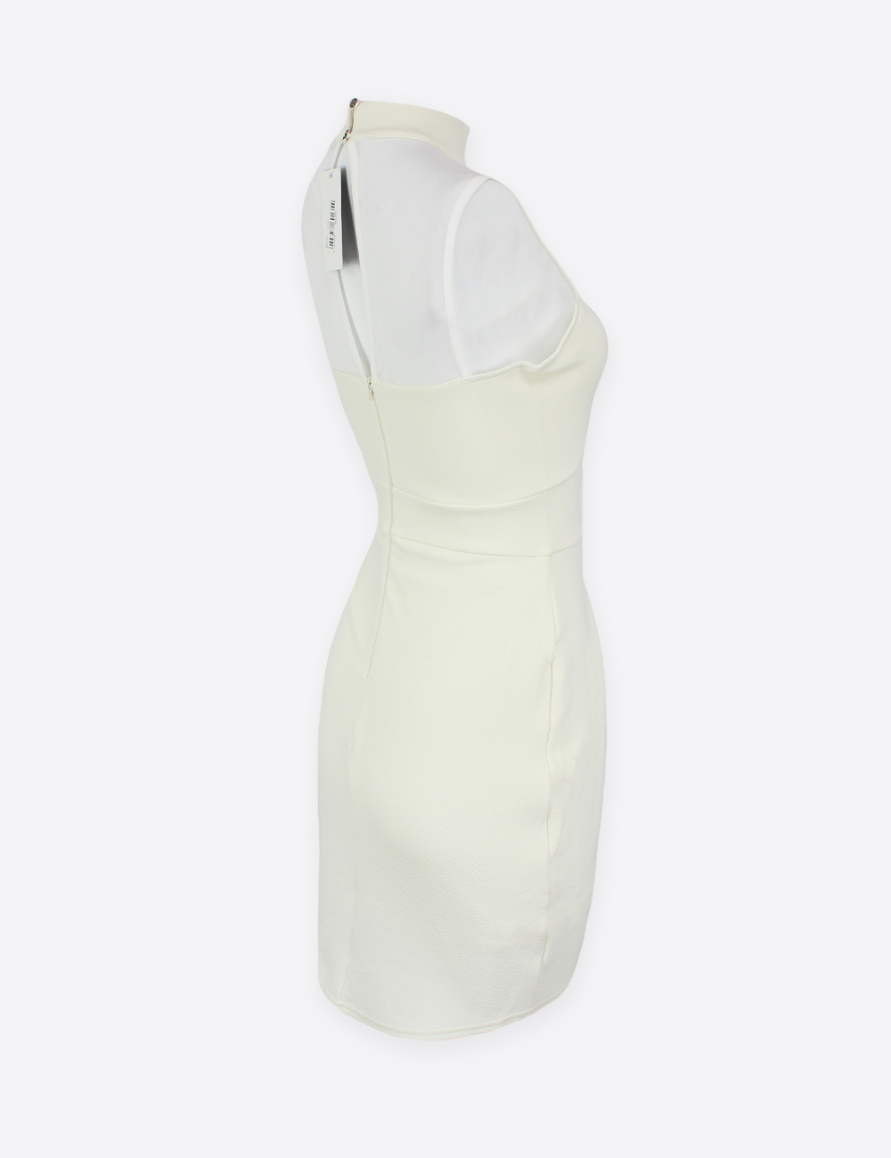 TFNC cream short illusion sleeveless dress with high neck and wrap over skirt, size M