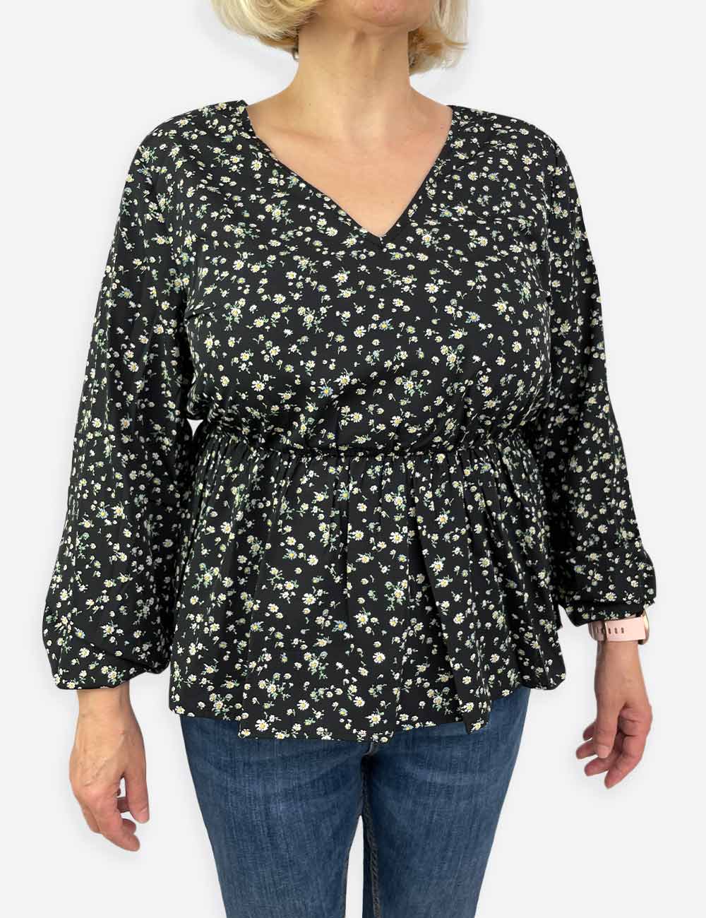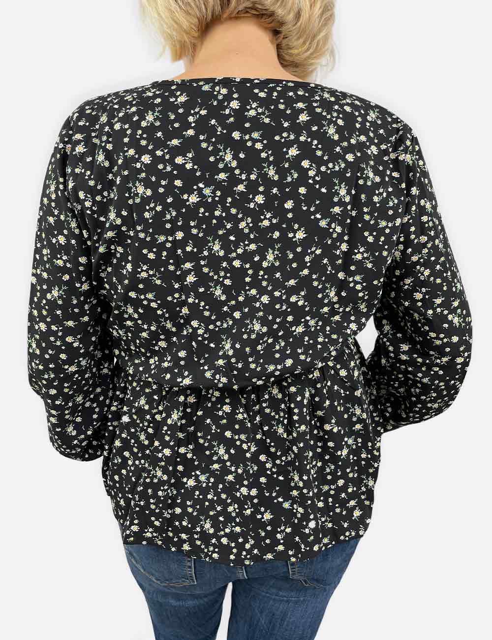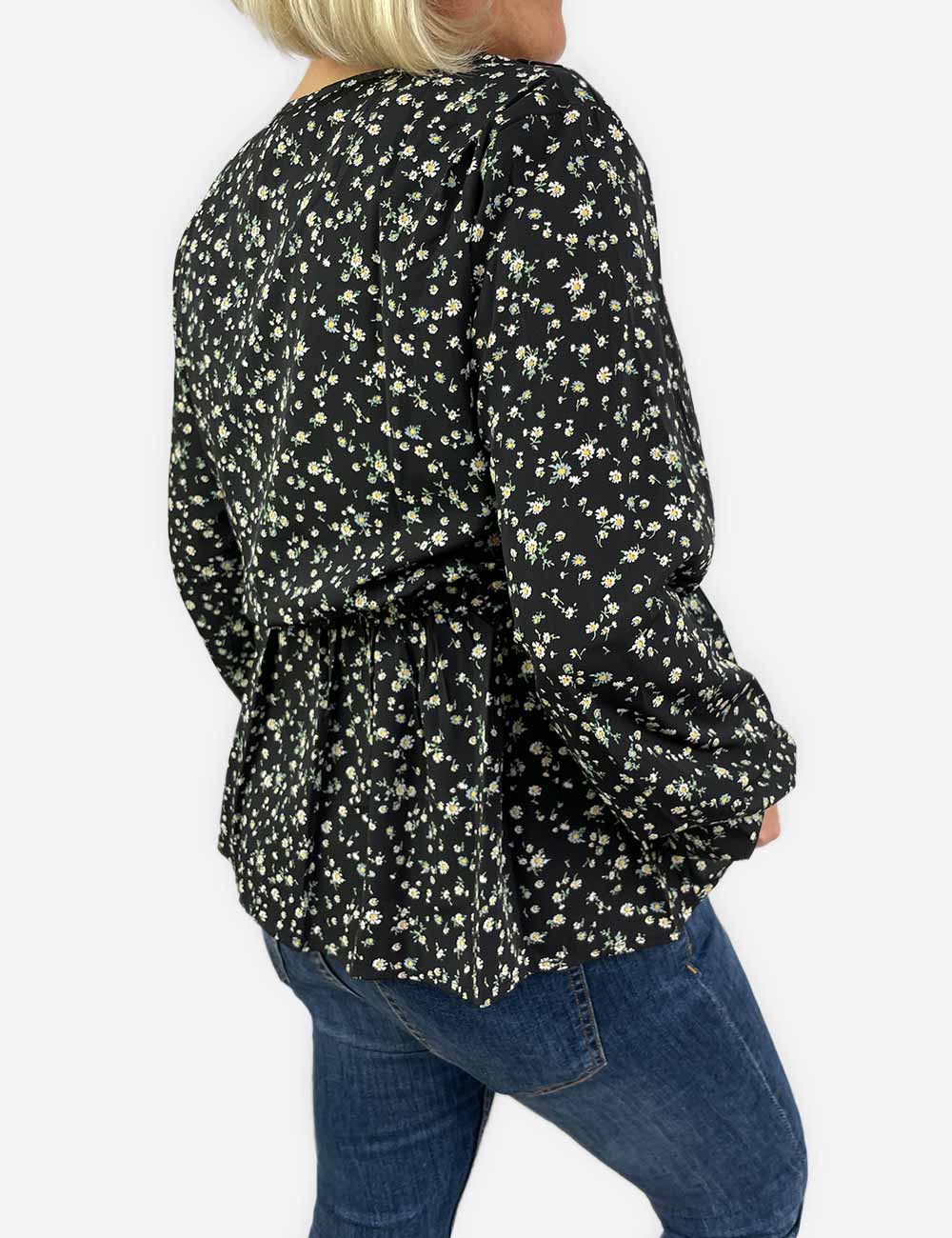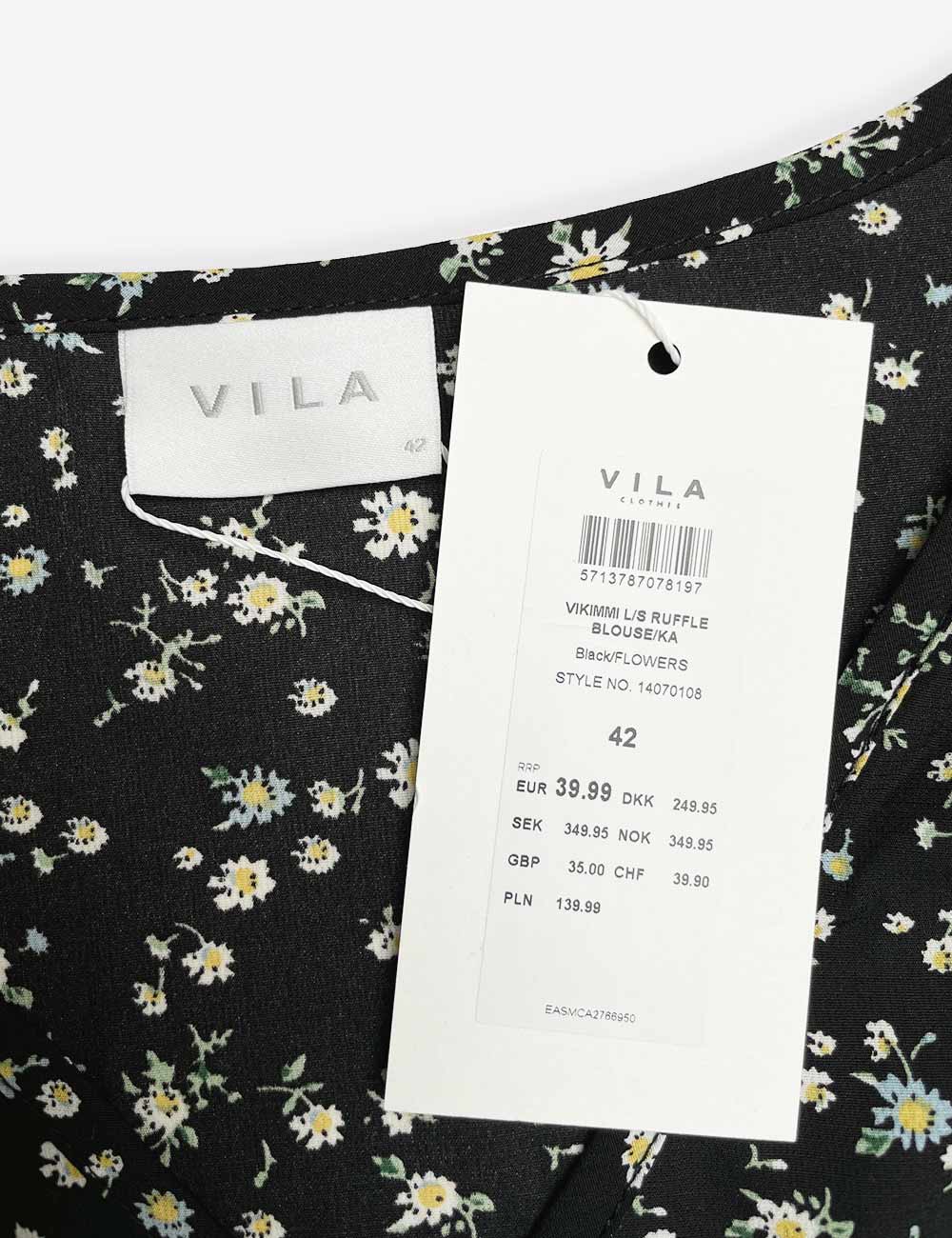 Vila black long sleeve blouse with fitted waits, v neckline, thin elastic sleeve hem and small flower pattern, size EU 42
